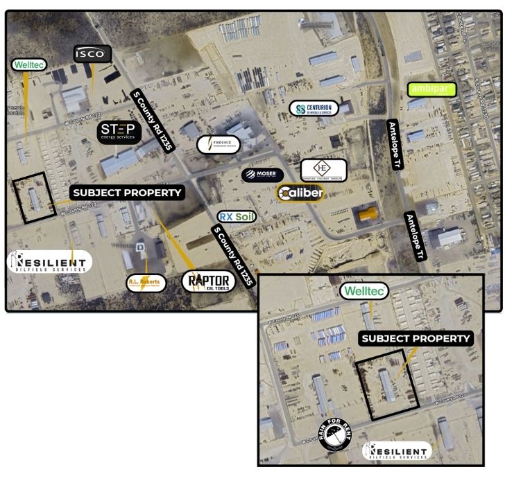 8,750 SF industrial building on 2.6 Acres in a fast-growing industrial park just South of the intersection of W. Loop 250 and I-20. The 2,500 SF Office consists of 4 private offices, a lab room that can be converted, a conference room, a break area, and two restrooms. The warehouse is 5,000 SF (100’ x 50’), featuring five 14’ x 16’ overhead doors forming three drive-in bays and one drive-through bay. Built a 5-ton crane ready with a below-grade maintenance pit in the center of the bay, which is fully insulated and includes a shop office and restroom with a shower. The covered wash-bay is 1,250 SF and drains to two 1,500-gallon underground tanks. There will also be covered parking in front of the building. The property is fenced and secured with 3-strand security fencing and two 20’ cantilever gates. The property has 3-Phase/480V power, septic, and AT&T Fiber running inside the industrial park (Tenant would have to pay all costs associated with Fiber installation).