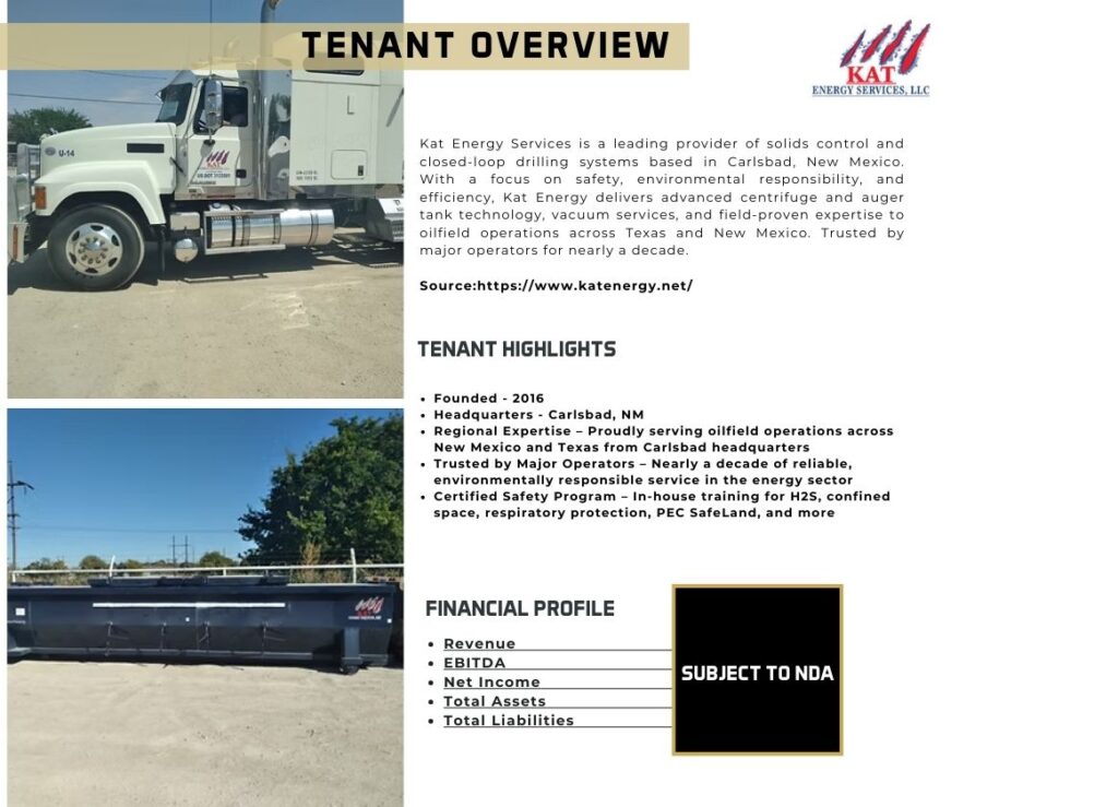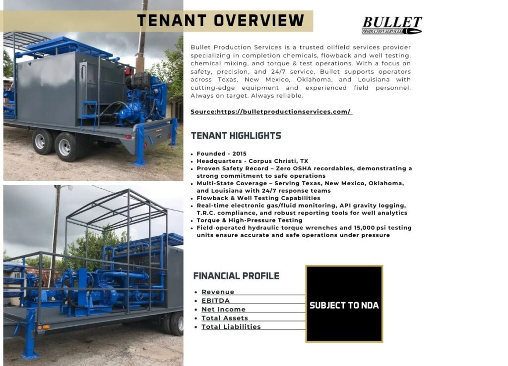 Bullet Production Services and Kat Energy Services are established oilfield service providers with strong operational histories and niche positioning in the Permian Basin. Bullet specializes in fluid management and torque services with a safety-focused reputation and zero OSHA recordables, while Kat Energy offers proprietary solids control and closed-loop mud tank systems with significant environmental compliance advantages. Both tenants serve critical functions for upstream energy operators, enhancing the long-term stability and relevance of their tenancy. This is an attractive value-play investment featuring durable in-place cash flow, strategic location, and strong tenant alignment with energy sector demand.